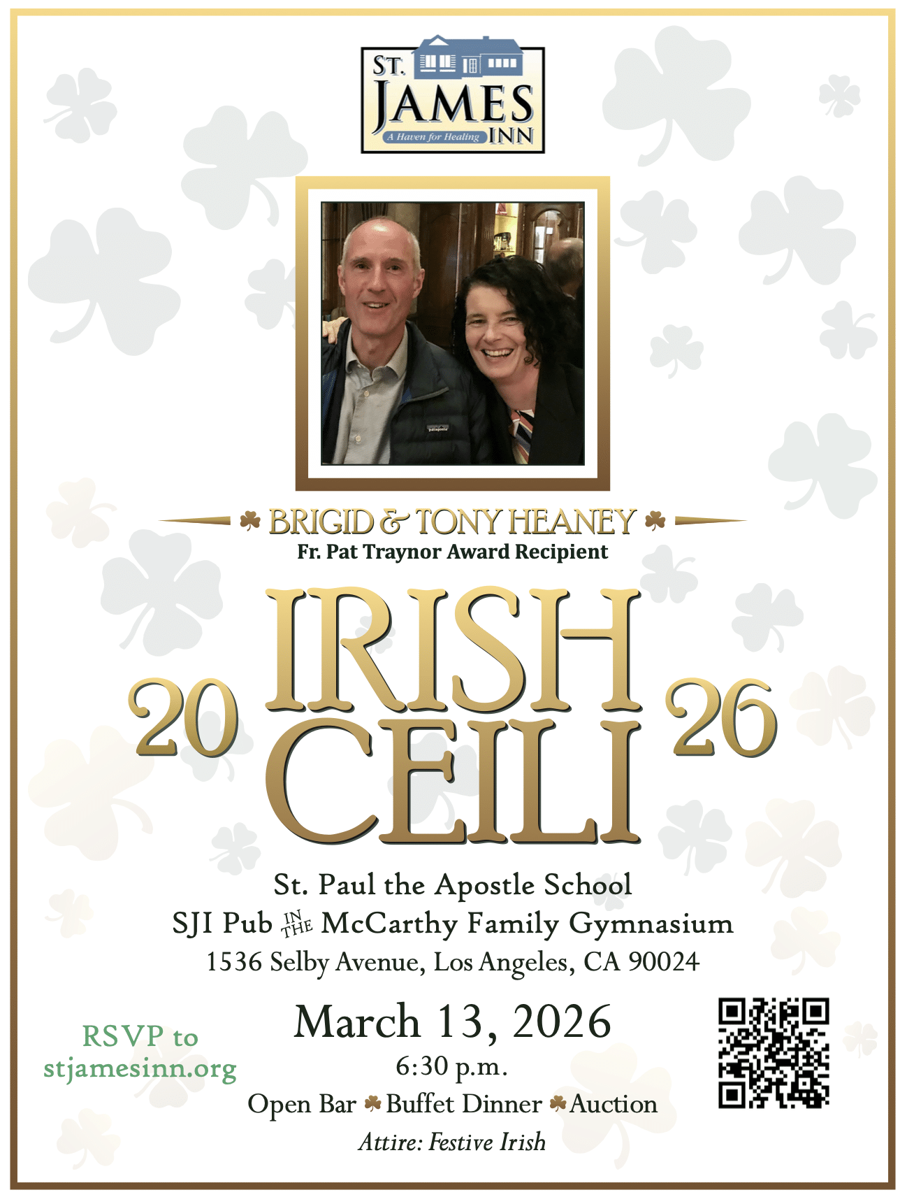 Long-time SPA parishioners and SJI supporters Brigid and Tony Heaney will receive the Fr. Pat Traynor Award. It is sure to be a wonderful evening raising needed funds, connecting with friends old and new, and also celebrating our new Fourth Home!