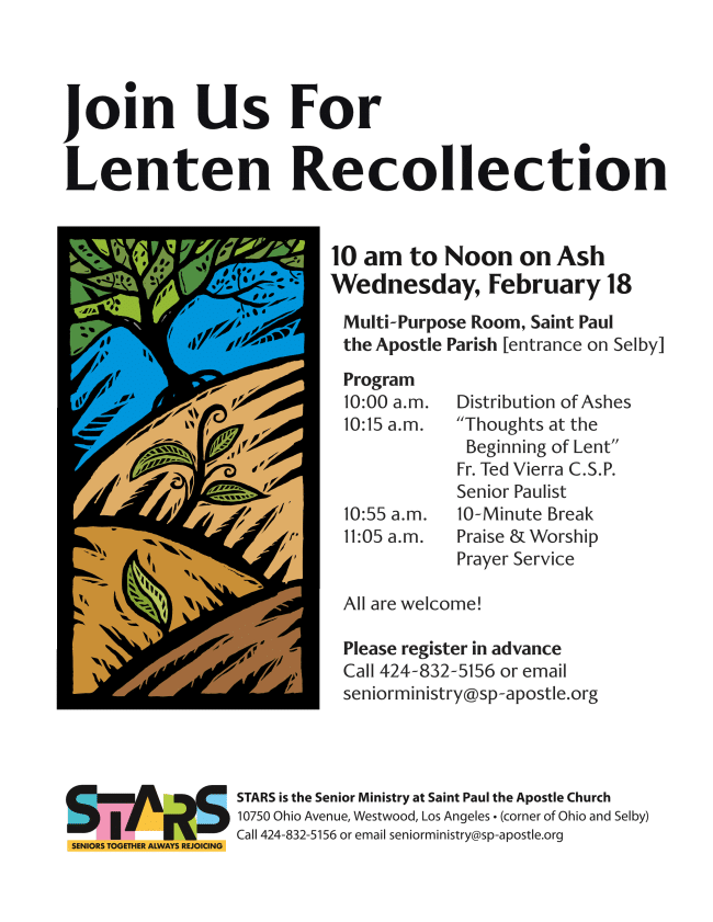 Join STARS (Seniors Together Always Rejoicing) on Ash Wednesday, Feb. 18th for a nourishing morning of prayer and fellowship with a special talk by Fr. Ted. We will gather from 10:00am-12:00pm in the Multi-Purpose Room.