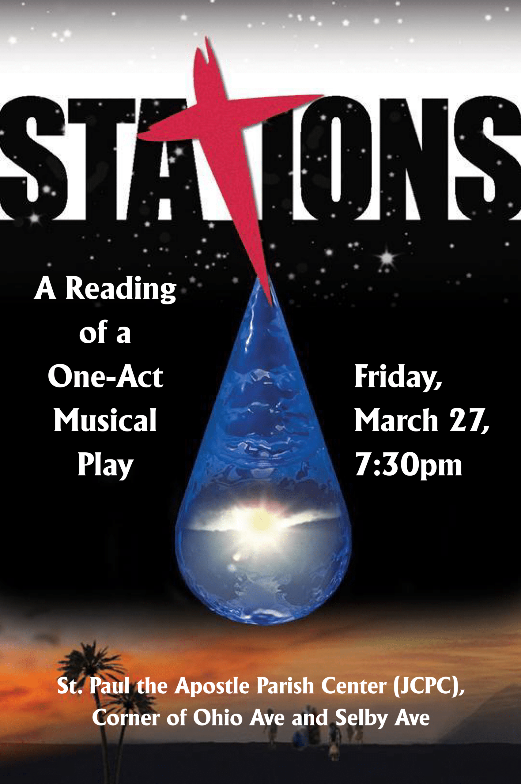 Join us for a special reading of STATIONS: A Musical Play by Fr. Mark on Friday, March 27 at 7:30pm in the Parish Center (JCPC). Through music and storytelling, performers from our community bring to life the experiences of four individuals at a Stations of the Cross service during Lent.